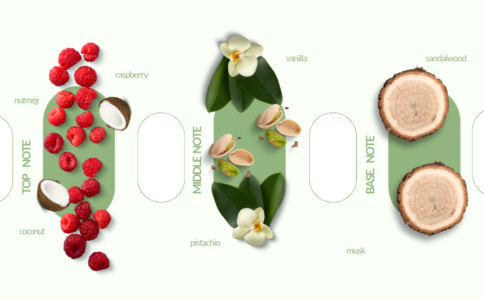 Key Notes: Coconut, Raspberry, Vanilla, Pistachio, Sandalwood, Musk